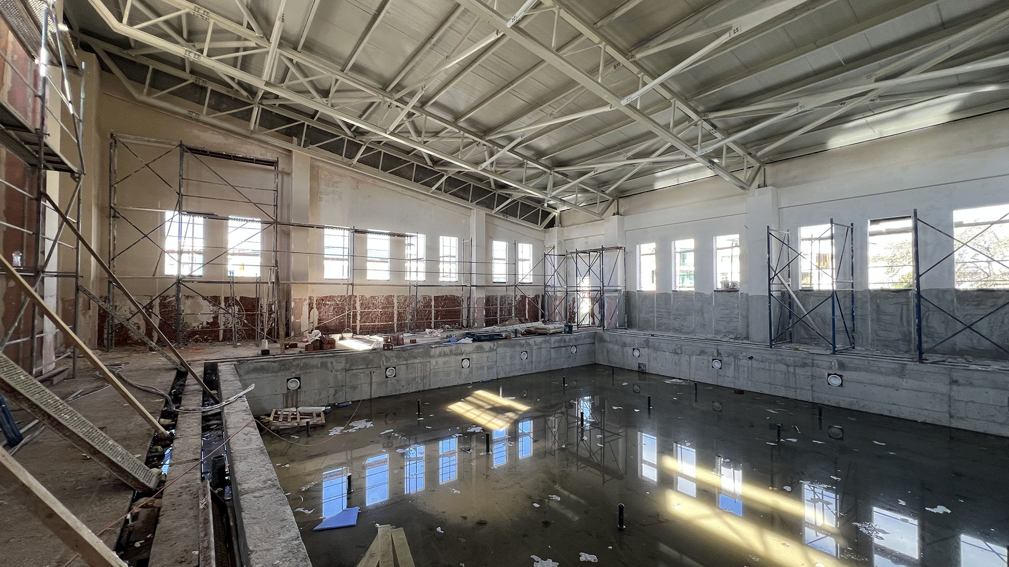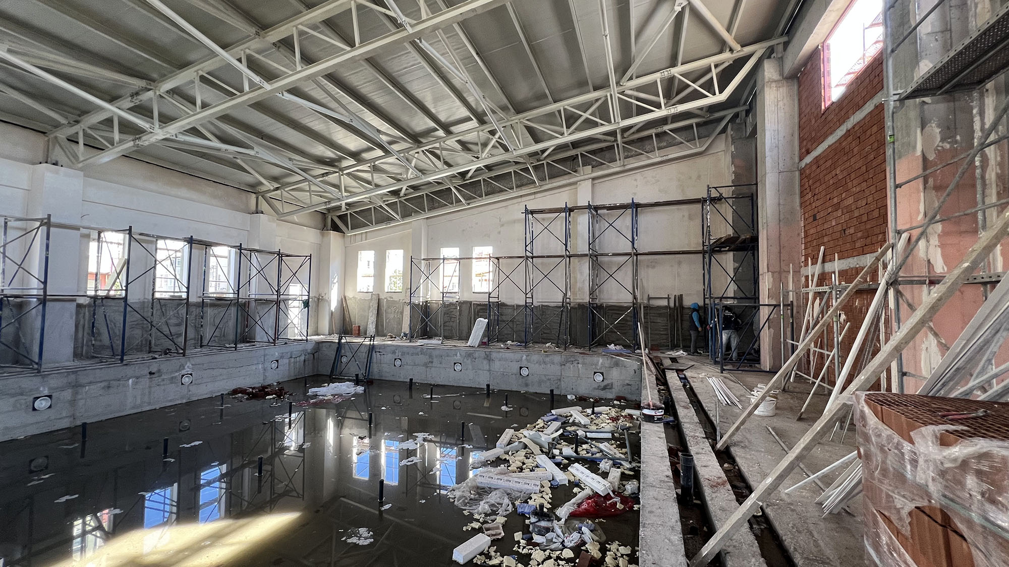 4 bin metrekare alan üzerine inşa edilen yarı olimpik yüzme havuzunda betonarme ve çelik çatı imalatları tamamlandı. Duvar örme işlemleri bitirilen havuz bölümünde dış sıva ve mantolama çalışmaları ise devam ediyor.