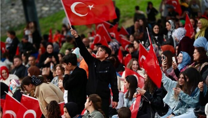 Tribünde ay-yıldızlı bayraklar