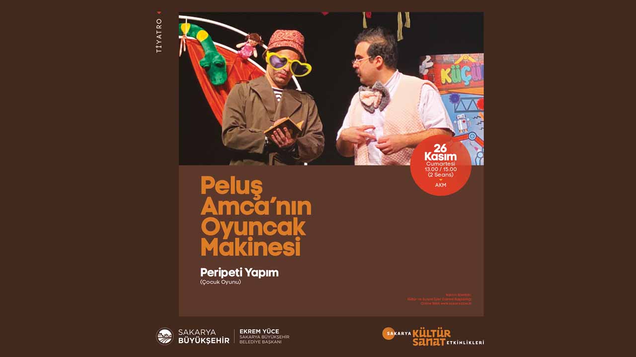 Sakarya Büyükşehir Belediyesi Kasım kültür sanat etkinlikleri tüm hızıyla devam ediyor. Bu kapsamda 26 Kasım Cumartesi günü saat 13.00 ve 15.00’da AKM’de çocuklar için tiyatro oyunu sahnelenecek. Peripeti Yapım tarafından hazırlanan ‘Peluş Amca’nın Oyuncak Makinesi’ isimli çocuk oyunu miniklere unutamayacakları bir gün yaşatacak. Kültür ve Sosyal İşler Dairesi Başkanlığından yapılan açıklamada, “Katılımın biletli olduğu ‘Peluş Amca’nın Oyuncak Makinesi’ isimi çocuk oyunu için biletlere www.sakarya.bel.tr adresinden ya da Kültür ve Sosyal İşler Dairesi Başkanlığımızdan temin edebilirsiniz” denildi.