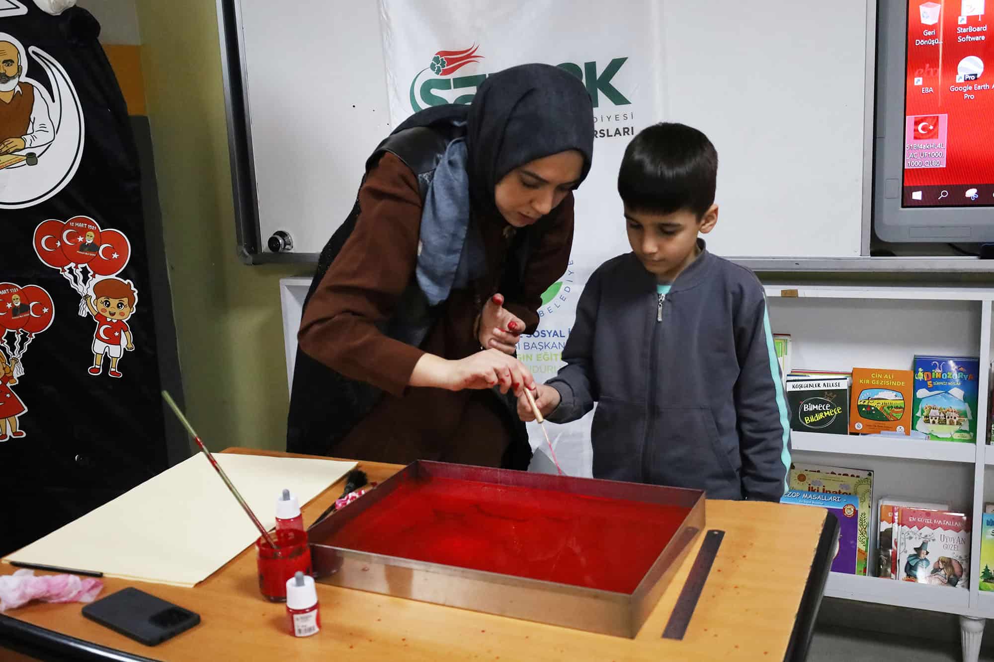 Anma programının ardından düzenlenen ebru atölyesi etkinliğinde, öğrenciler SAMEK eğitmenlerinin rehberliğinde geleneksel ebru sanatı ile tanıştı. Çalışmada öğrenciler, ebru tekniğiyle Türk bayrağı temalı eserler ortaya koydu.