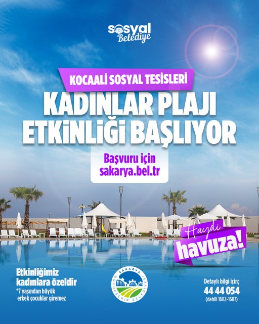 SAKARYA – Sosyal belediyecilik çalışmalarına bir yenisini daha ekleyen Sakarya Büyükşehir Belediyesi, yaz sezonu boyunca her çarşamba ve perşembe günü kadınları ücretsiz olarak Kocaali Sosyal Tesisleri ve Kadınlar Plajı’nda ücretsiz olarak misafir edecek. 25 ve 26 Haziran tarihlerinde yapılacak ilk etkinliklere kayıtlar www.sakarya.bel.tr adresinden başlayacak.